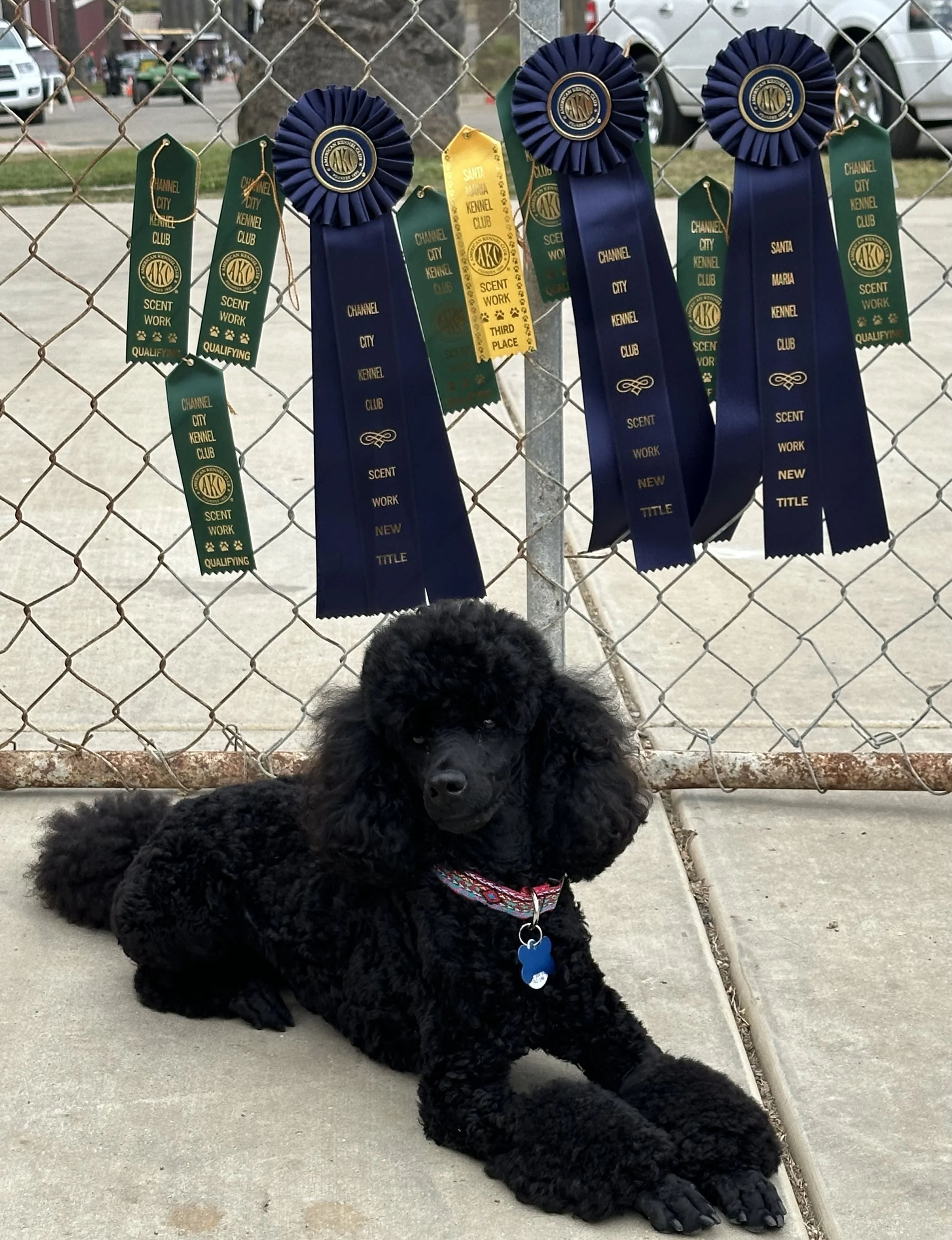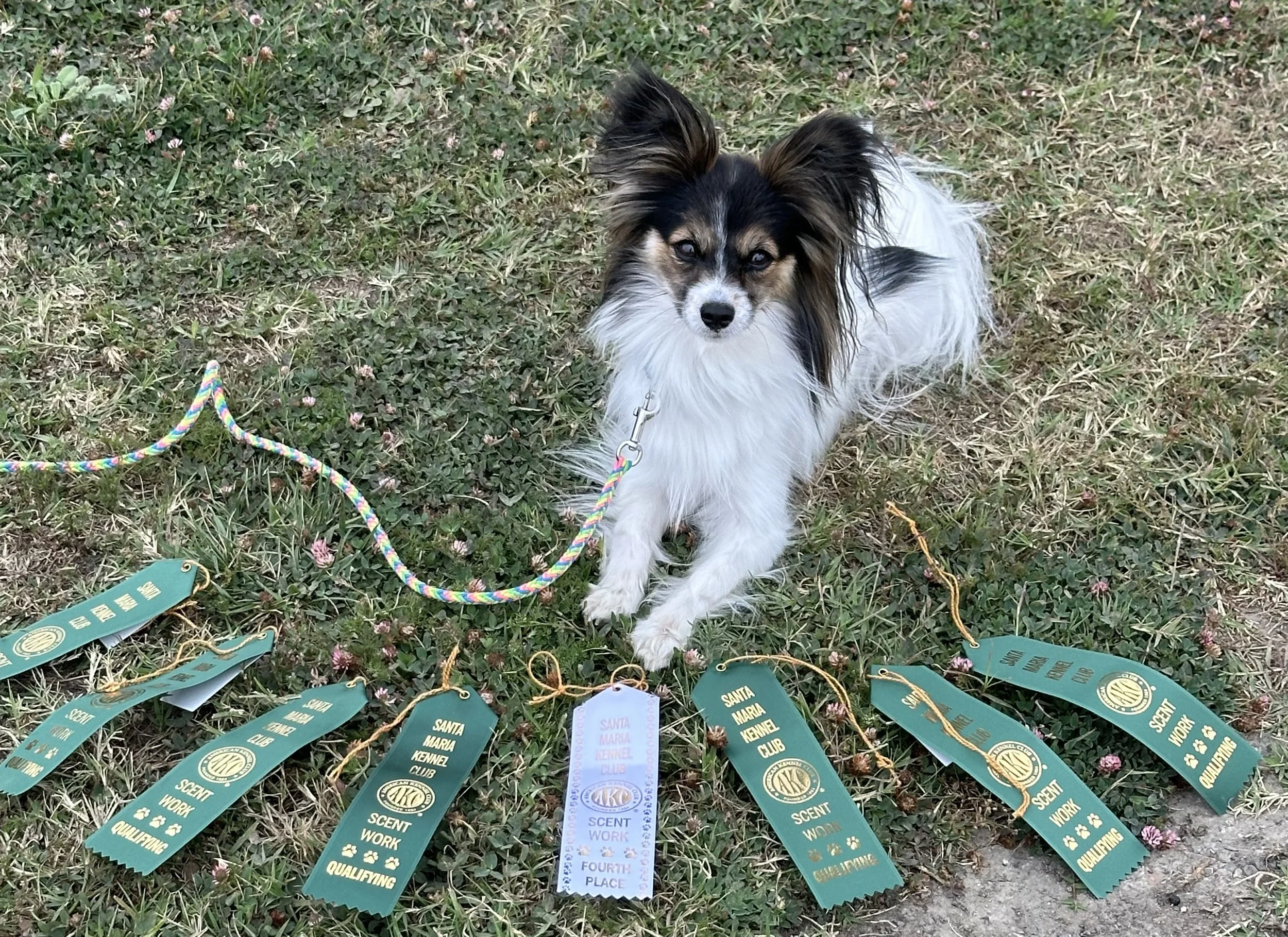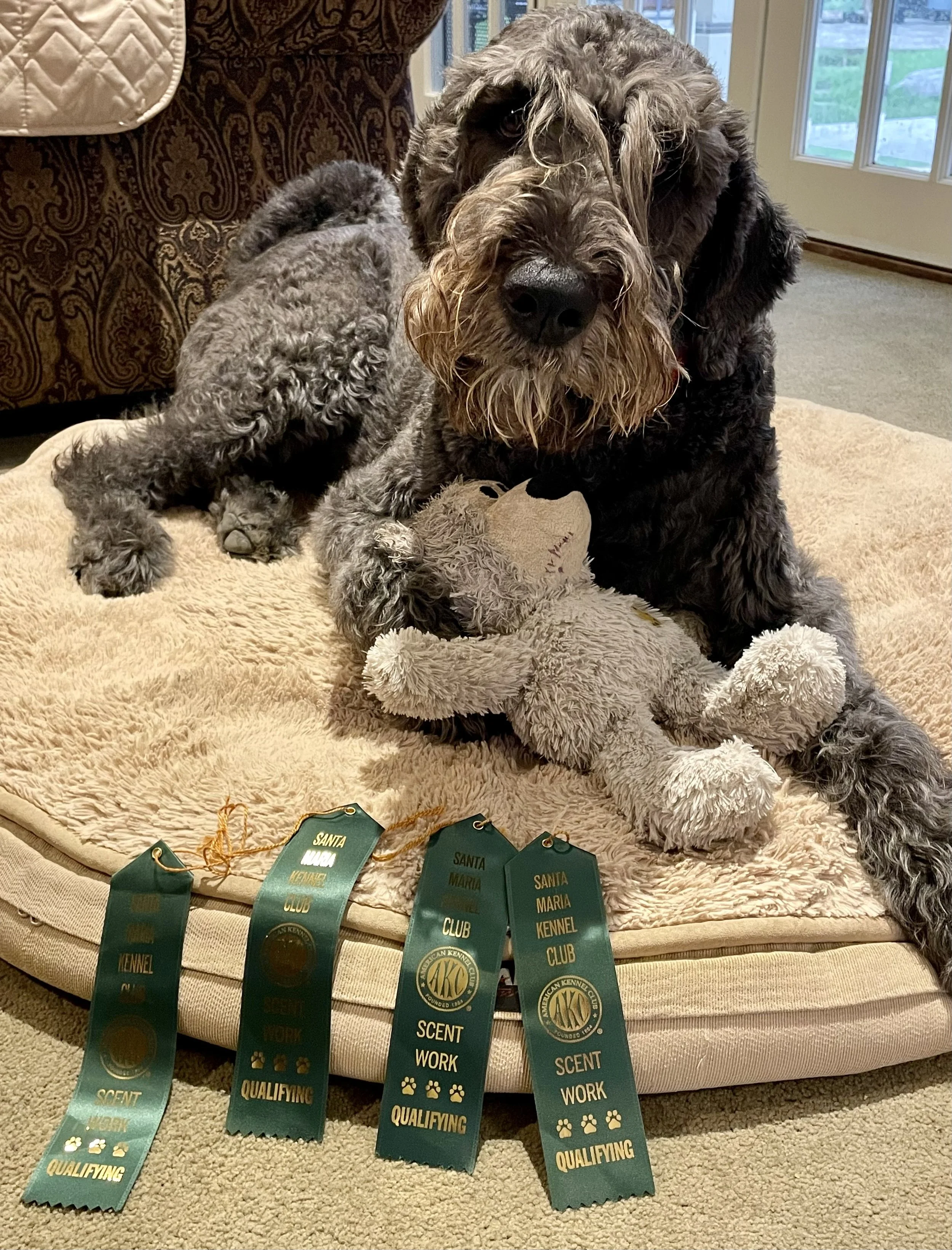 Sterling and Sophie earned two legs in Novice Exterior, Buried and Containers, and one leg in Novice Interiors at the Channel City Kennel Club trials on June 1 & 2. They placed 1st in Novice Interiors and 4th in Novice Exterior!